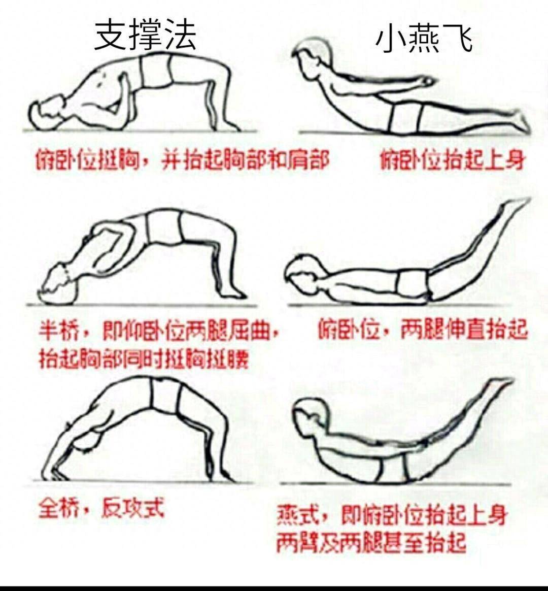 (“五点支撑”“小燕飞”标准姿势、呼吸节奏及注意事项。图源长沙市中医医院)
