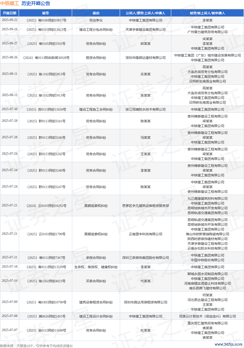 案号:(2025)粤0305民初4409号审理法院:广东省深圳市南山区人民法院案由:不当得利纠纷当事人信息: 原告/上诉人:中铁建工集团有限公司 被告/被上诉人:贵州黔源建筑设备租赁有限公司开庭日期:2025年6月20日根据统计,近一年内以中铁建工集团有限公司为当事人的历史开庭公告有687则,其中案由为“买卖合同纠纷”的公告以117则居首,其次为“建设工程施工合同纠纷”有112则,“劳务合同纠纷”有96则。历史开庭公告(前20条)如下: