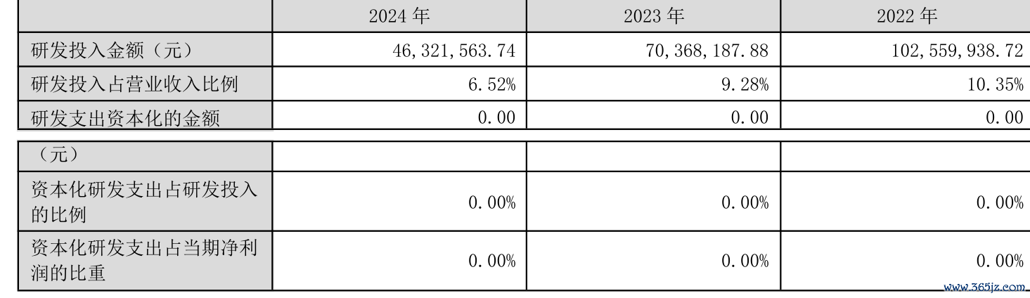 2024年全年,公司研发投入金额为4632.16万元,同比下降34.17%;研发投入占营业收入比例为6.52%,相比上年同期下降2.76个百分点。此外,公司全年研发投入资本化率为0%。