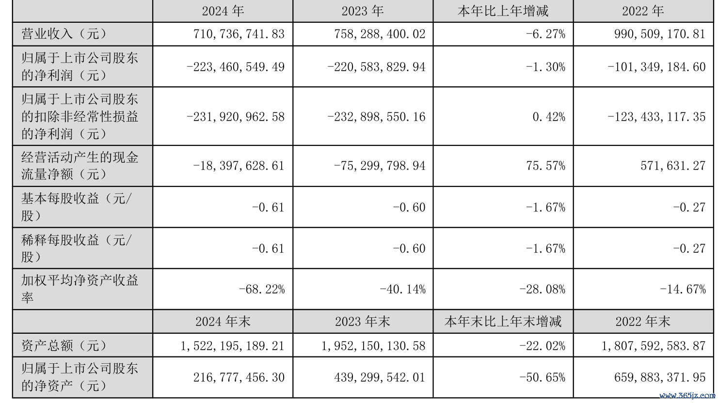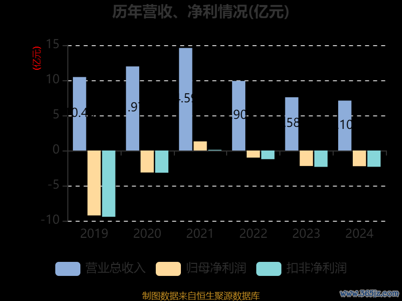 中证智能财讯正业科技(300410)4月25日披露2024年年度报告。2024年,公司实现营业总收入7.11亿元,同比下降6.27%;归母净利润亏损2.23亿元,上年同期亏损2.21亿元;扣非净利润亏损2.32亿元,上年同期亏损2.33亿元;经营活动产生的现金流量净额为-1839.76万元,上年同期为-7529.98万元;报告期内,正业科技基本每股收益为-0.61元,加权平均净资产收益率为-68.22%。